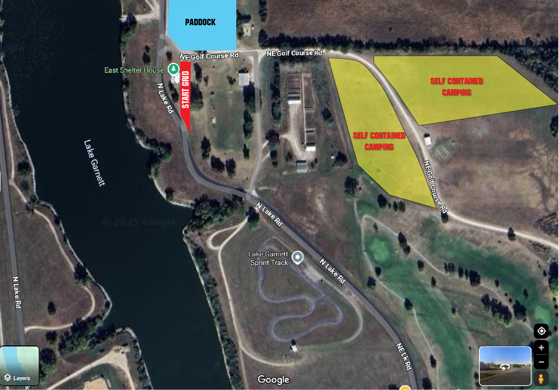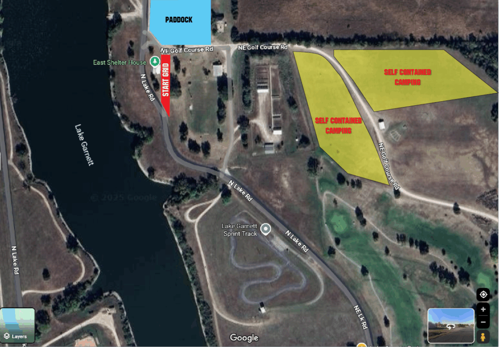 At the track: There is self contained camping on the hill above the paddock area. If you interested in that area, reservations will be handled through CampSpot.com. If you have any questions, contact Garnett Rec Center at 785-448-3023.